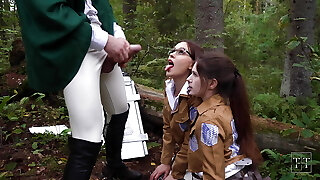 Attack on titan. Muddy 3 way blowjob for commander in the forest