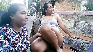 Sexy brunette demonstrates her big tits to her friends before a blowjob