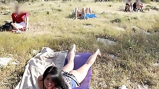 Big-boobed Cougar is walking almost naked on the public beach making everyone blush