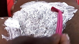 Nice jugs dark-hued bitch sucking and fucking a black dong after pussy shaving